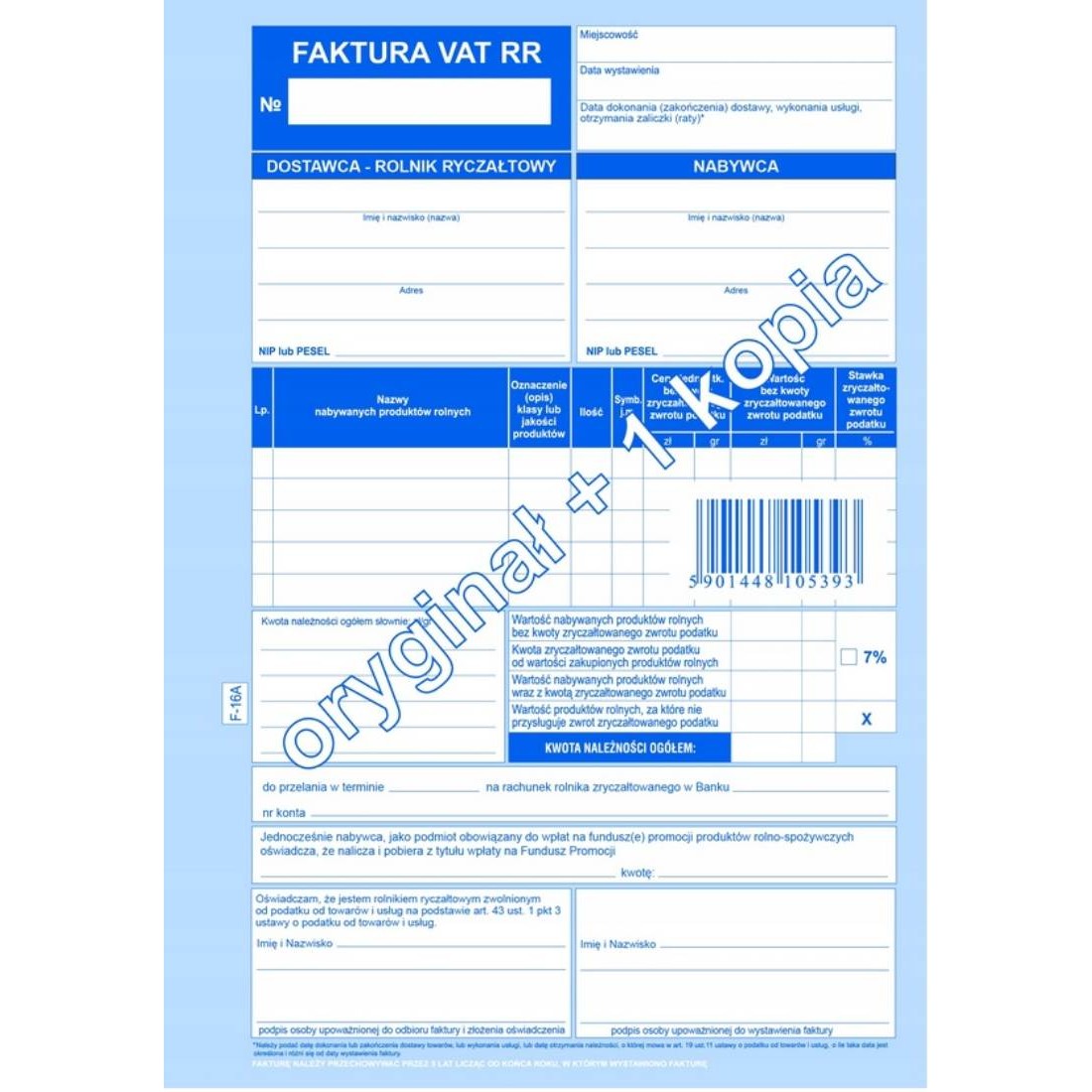 FAKTURA VAT RR DLA ROLNIKÓW (ORYGINAŁ + 1 KOPIA)