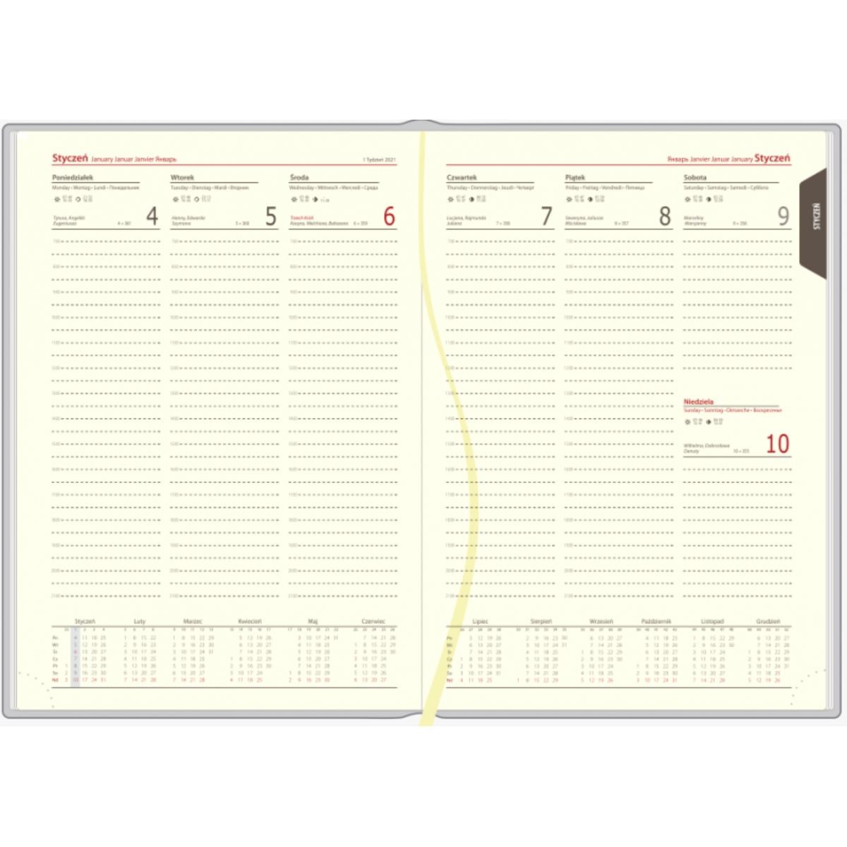 Kalendarz książkowy w formacie A4, układ tygodniowy, 1 tydzień na 2 stronach, zawiera 128 stron, oprawę skóropodobną. Bok szyty oraz dodatkowo klejony, wzmocniony krepą. Tasiemka i kapitałka w kolorze kremowym. Papier chamois 70g/m2 użyty w kalendarzu posiada nadruki w dwóch kolorach (szarym oraz bordowym).