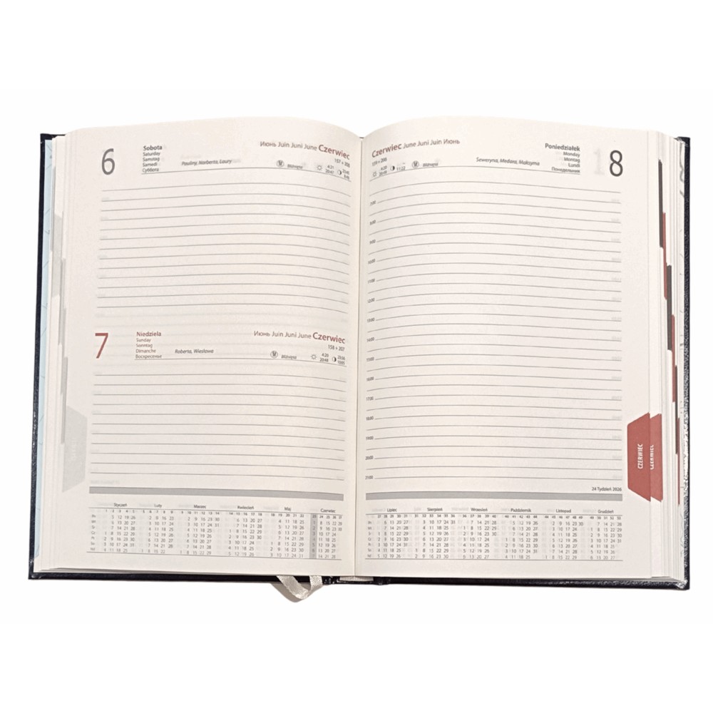 Kalendarz książkowy B6 2026 to świetny artykuł biurowy, który pomoże Ci zaplanować każdy dzień w najmniejszych szczegółach. Posiada precyzyjną rozpiskę godzinową z miejscem dla szczegółowych notatek, zaś sobota i niedziela na jednej stronie z wolnym polem na zapiski. Model B6 genialnie nadaje się do biura, dla zakładu fryzjerskiego, kosmetycznego lub gabinetu lekarskiego. Kalendarz poinformuję cię o każdym zbliżającym się święcie czy imieninach, wschodzie i zachodzie słońca, fazach księżyca oraz aktualnym znaku zodiaku. Posiada kalendarium 5-języczne: PL, EN, D, RUS, FR, a na dole strony plan całego roku.
