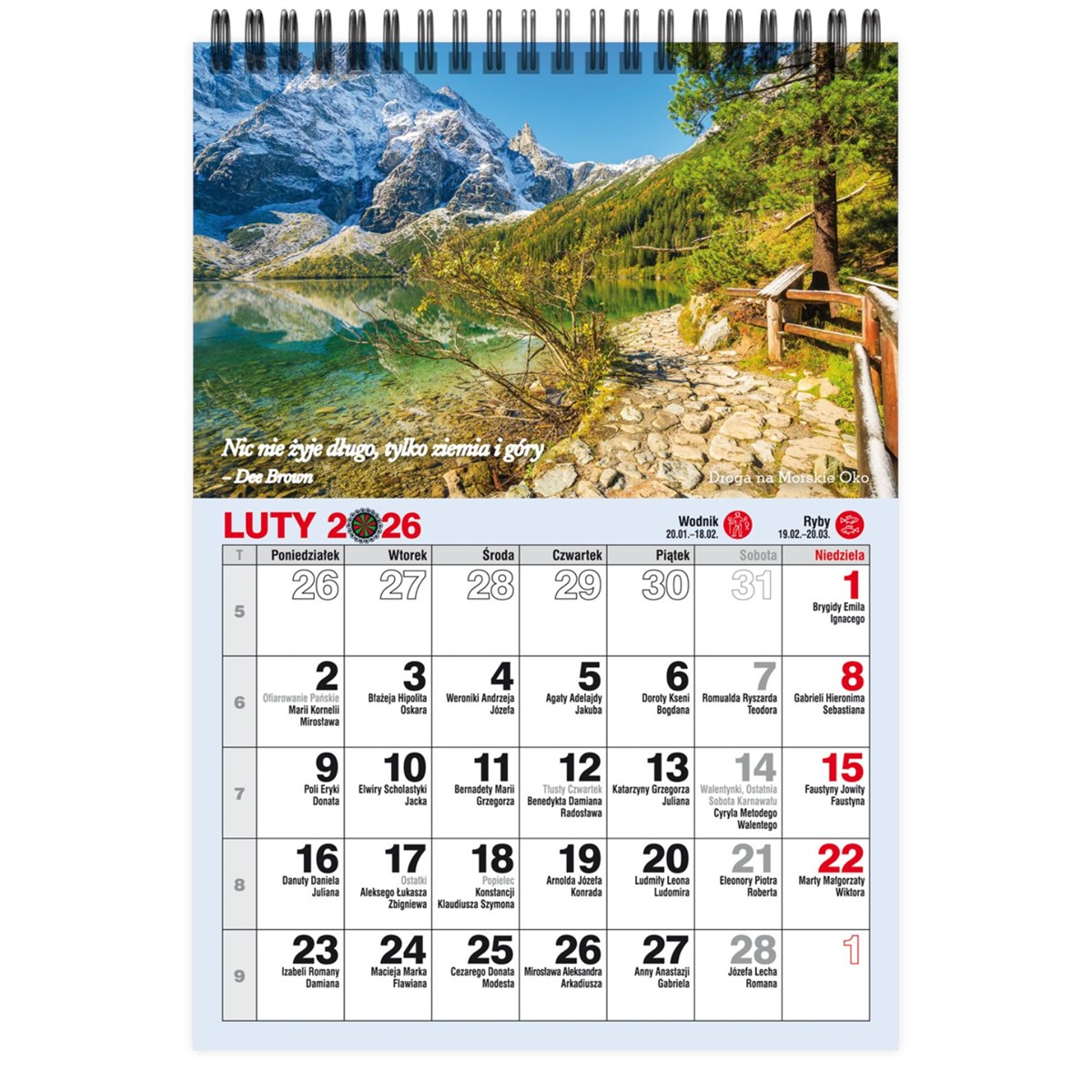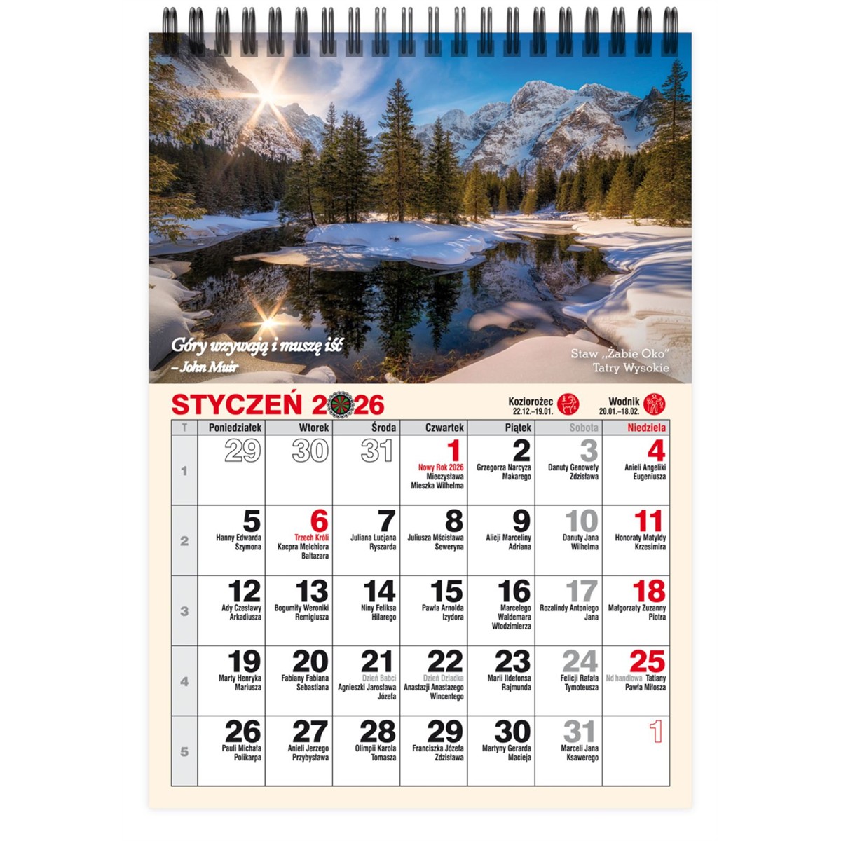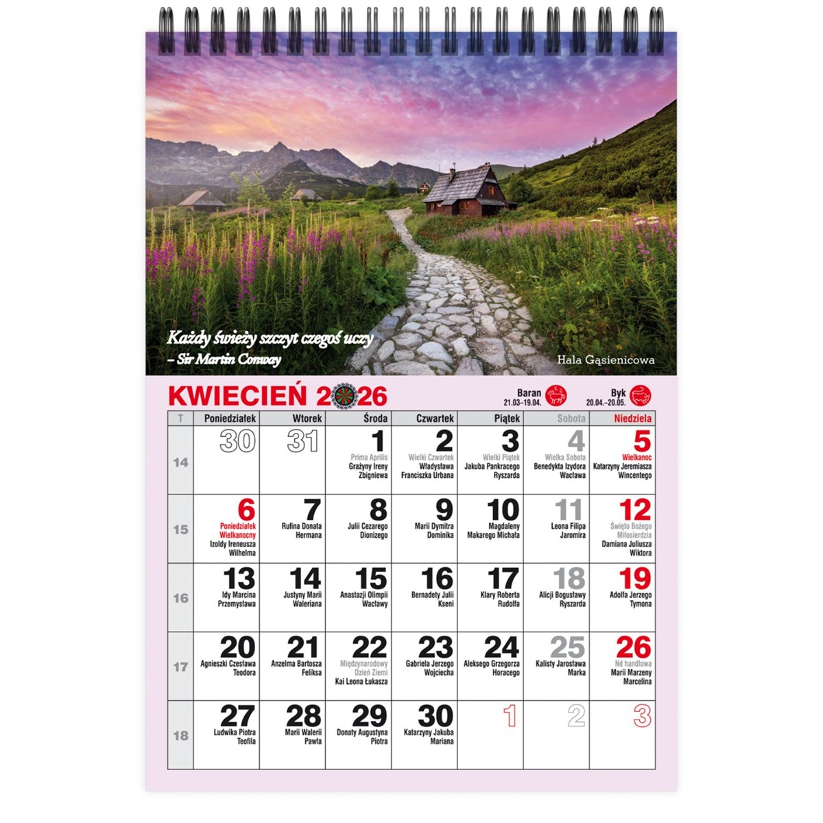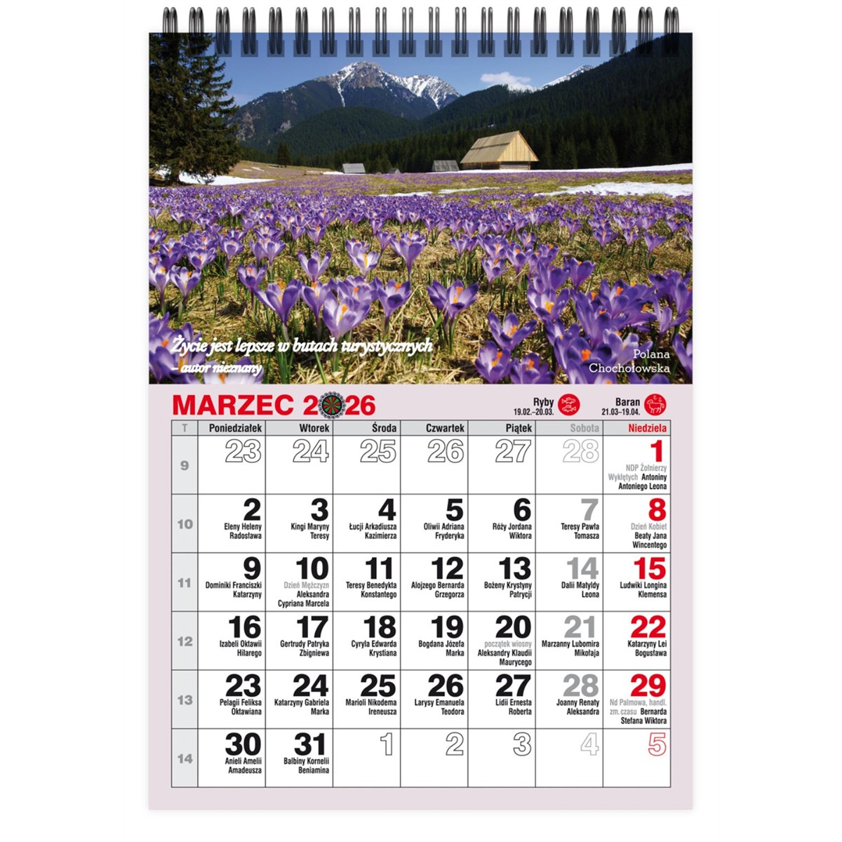 Czytelne kalendarium z miejscem na notatki, znaki zodiaku, podpisane zdjęcia i górskie sentencje na każdy miesiąc.