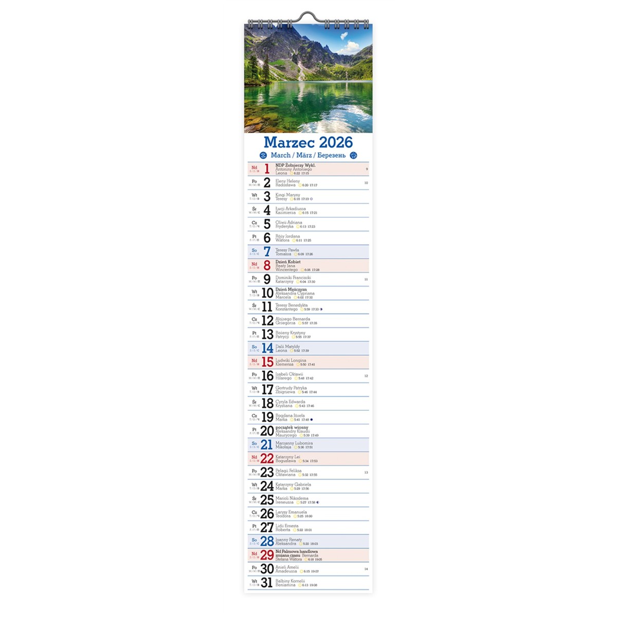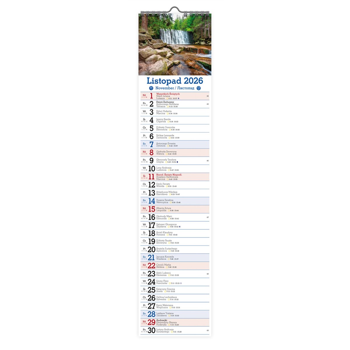 • Kalendarium zawiera imieniny, nazwy Świąt, czasy wschodów i zachodów Słońca oraz fazy Księżyca.