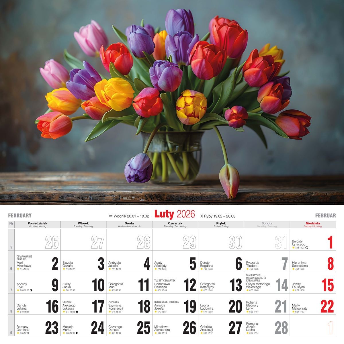 - nazwy miesięcy i dni tygodnia po polsku, angielsku i niemiecku