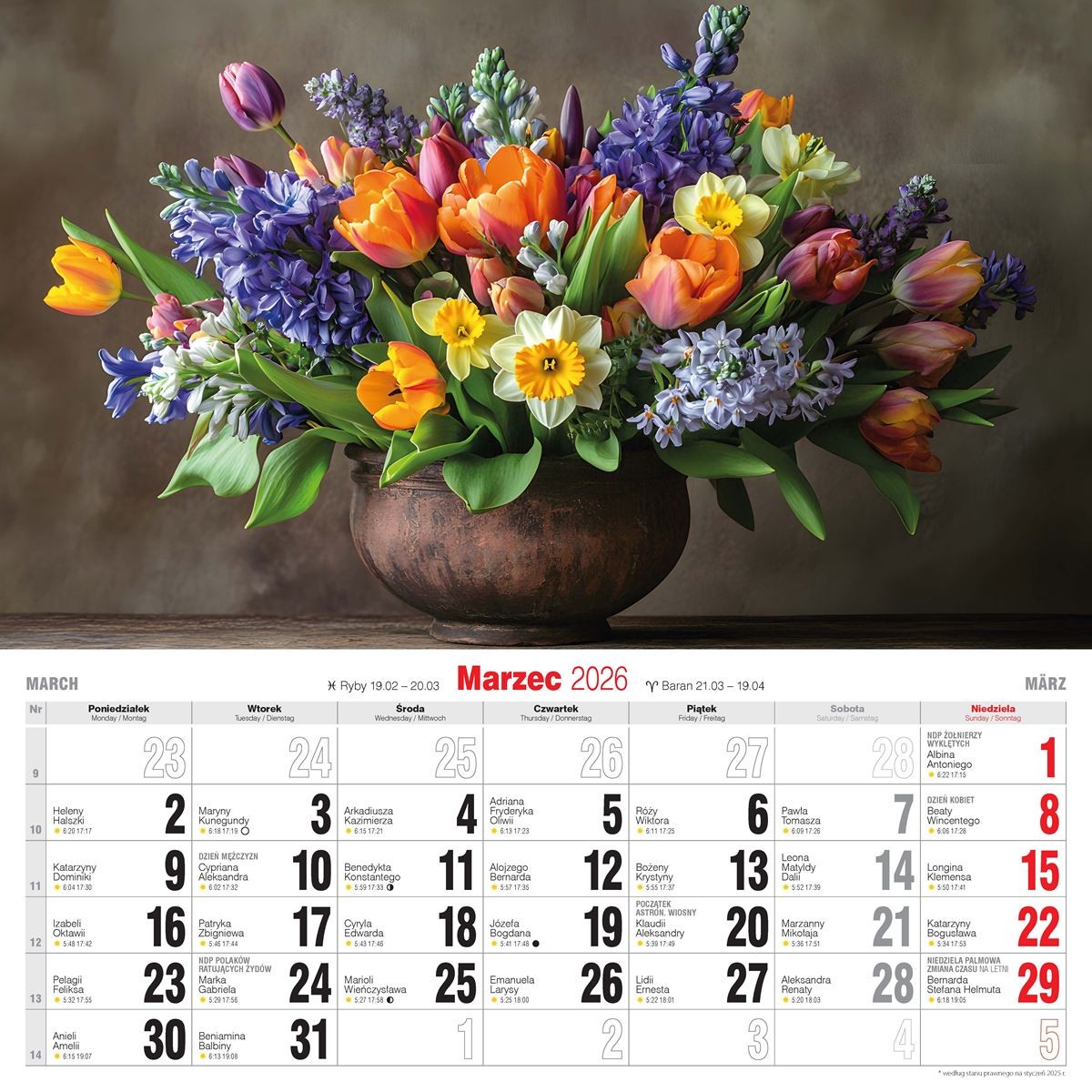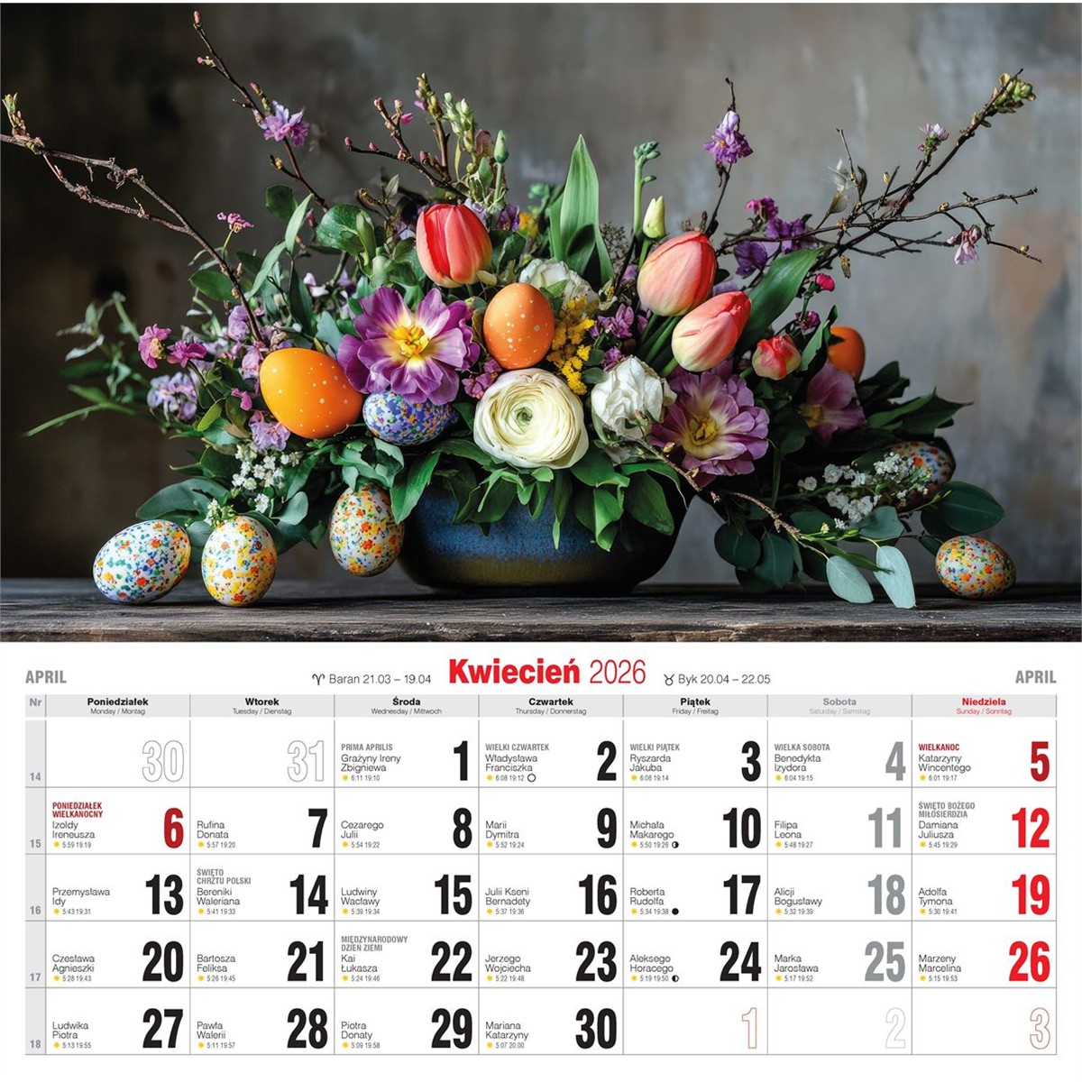 Duży, solidny kalendarz ścienny, drukowany na papierze kredowym.