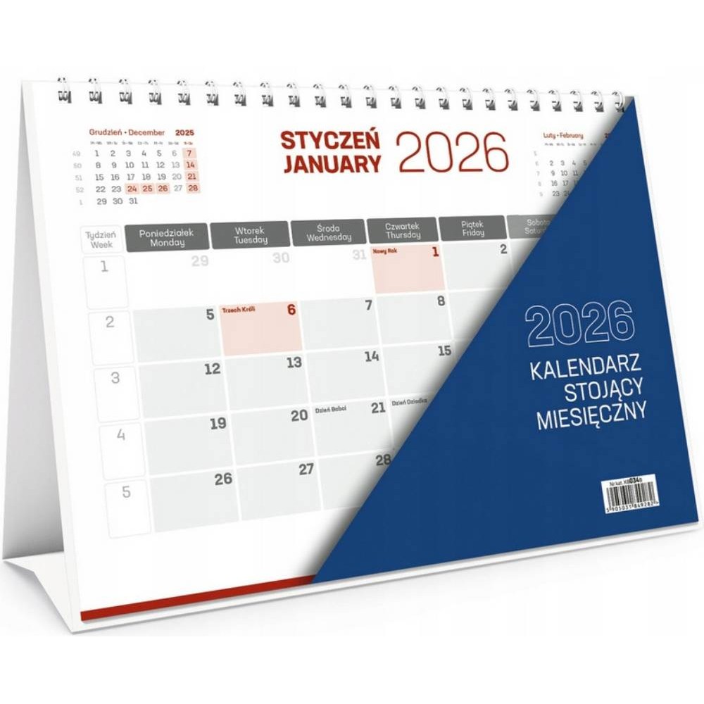 Praktyczny kalendarz biurkowy stojący w układzie miesięcznym, zapewniający wygodny wgląd w plan całego miesiąca oraz miejsce do codziennych notatek.