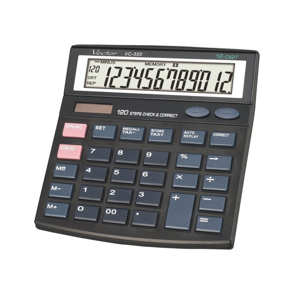 Kalkulator z 12 pozycyjnym wyświetlaczem. Posiada funkcję Check & correct do 120 kroków, obliczanie podatku TAX, klawisz cofania, zmiany znaku +/-.