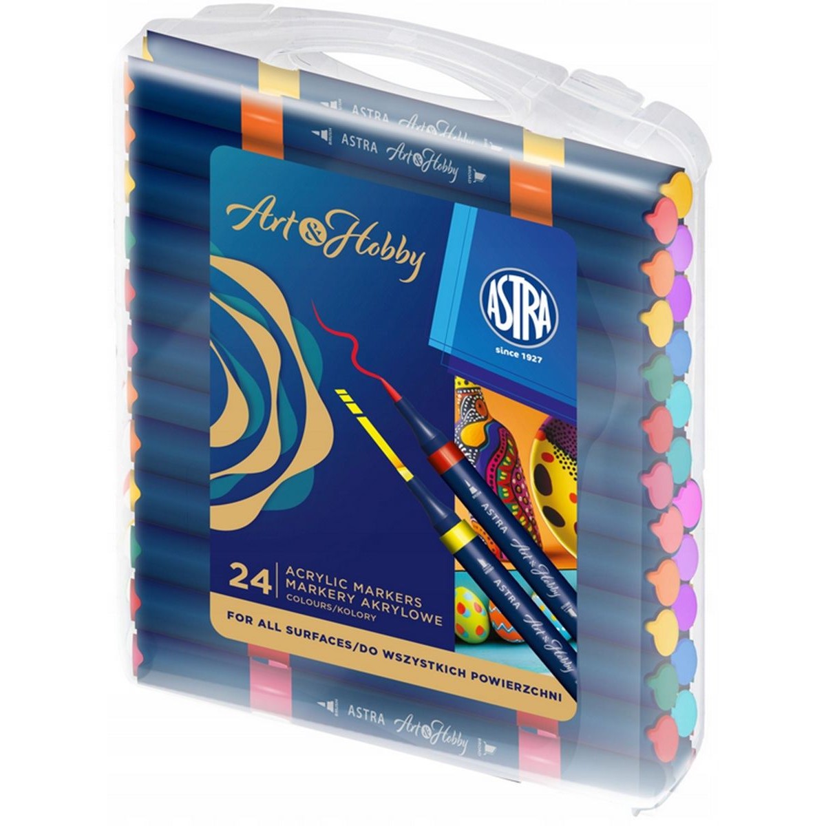 Odkryj wszechstronność i jakość z markerami akrylowymi dwustronnymi Astra. Ten zestaw 24 kolorów to idealne narzędzie dla artystów, hobbystów i wszystkich, którzy cenią sobie kreatywność i precyzję w pracy twórczej.