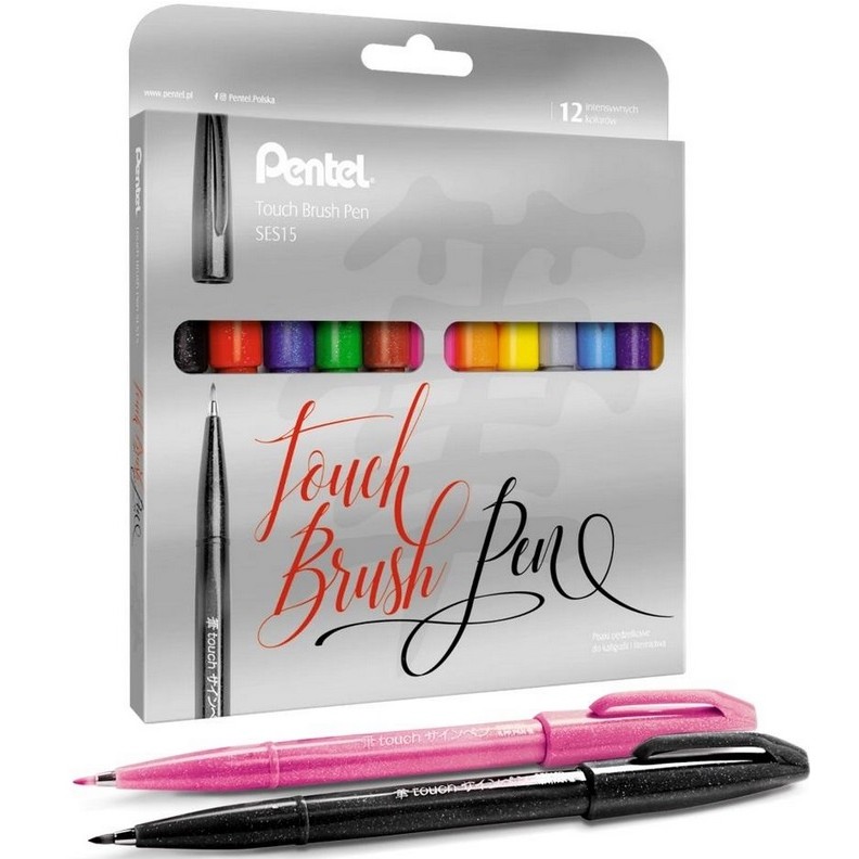 Pisaki pędzelkowe SES15 marki Pentel to zestaw 12 pisaków pędzelkowych z delikatną, elastyczną końcówką. Stworzone do tworzenia pisma ozdobnego, hand lettering. Niezwykle popularne w mediach społecznościowych jako pisaki do kaligrafii #penteltouch.
