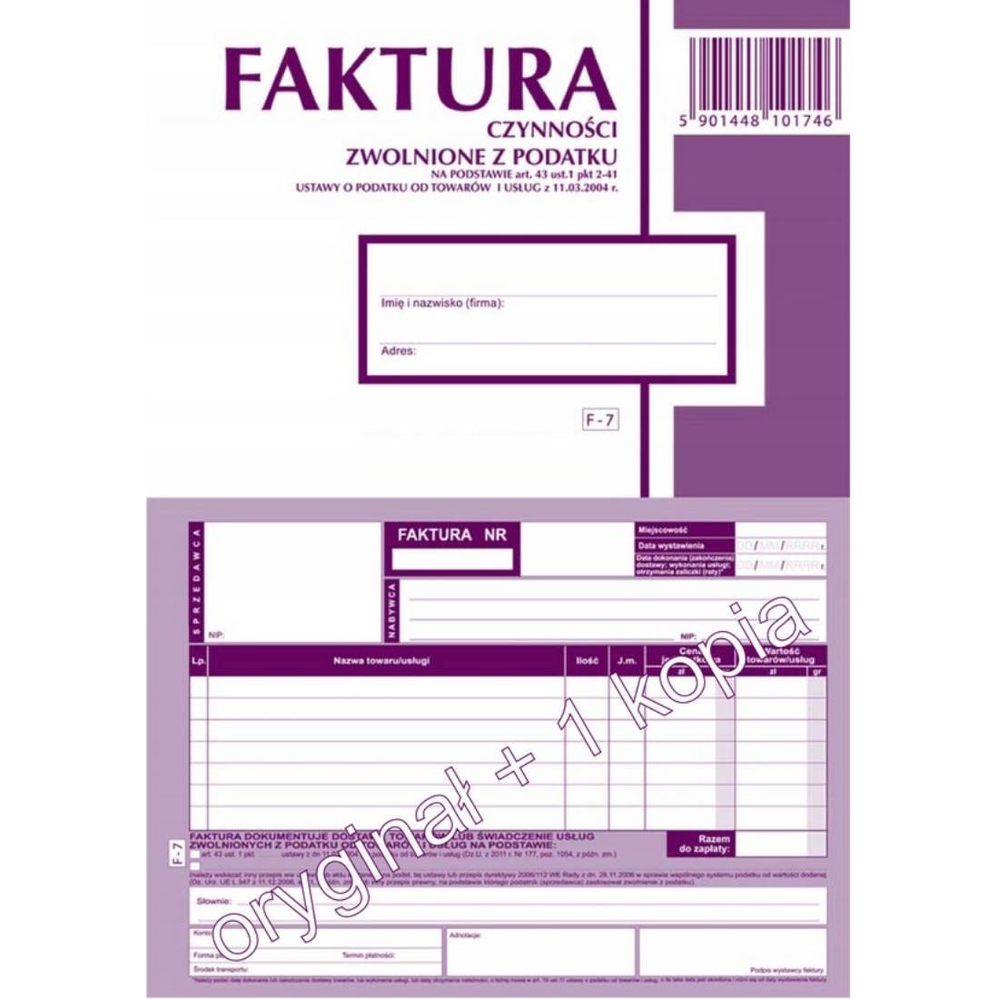 Faktura A5/80sk czynności zwol. z podat SIER F-7