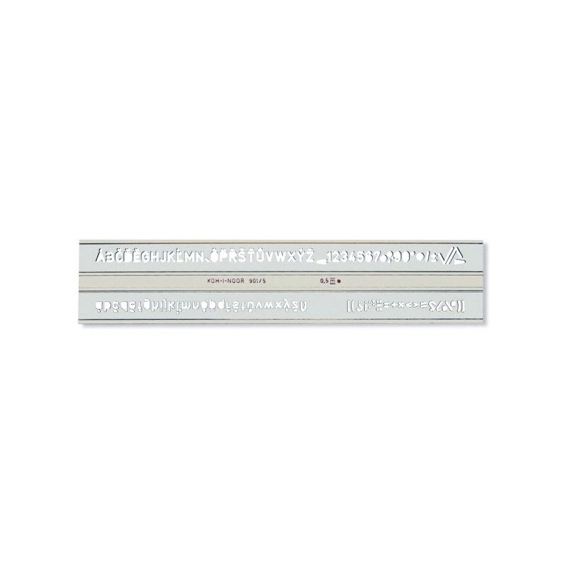 Szablon literowo-cyfrowy pisma pionowego. Umożliwia pisanie liter małych, dużych, cyfr, znaków interpunkcyjnych i specjalnych oraz symboli matematycznych, w szerokim zakresie wysokości od 2,5 do 20 mm. Wykonany jest z dymionego tworzywa sztucznego. Przystosowany do kreślenia tuszem.