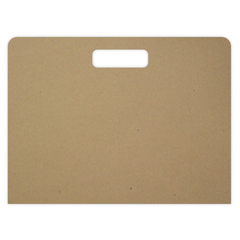 Teczka wykonana z szarego kartonu o grubości 2,5 mm. Posiada 2 wewnętrzne zakładki oraz wyciętą rączkę do noszenia.