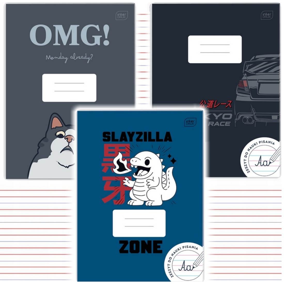 Okładka pokryta lakierem UV. Zeszyt służy do nauki pisania. Z tyłu okładki znajdują się pomoce edukacyjne, ułatwiające zapamiętanie polskiego alfabetu oraz poprawnej pisowni.